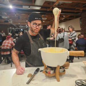 Which cheeses are best? “Most common versions [of fondue] use Le Gruyère AOP and Emmentaler AOP cheeses,” says Kaya Freiman, Emmi Roth’s communications manager. When Adam Moskowitz, a third-generation cheese importer, makes fondue, he uses a 50/50 blend of 1655 Gruyère and Challerhocker, another Alpine Swiss cheese. Appenzeller or Vacherin Fribourgeois are options as well, according to Isabelle Schilt, a marketing manager for Mifroma.