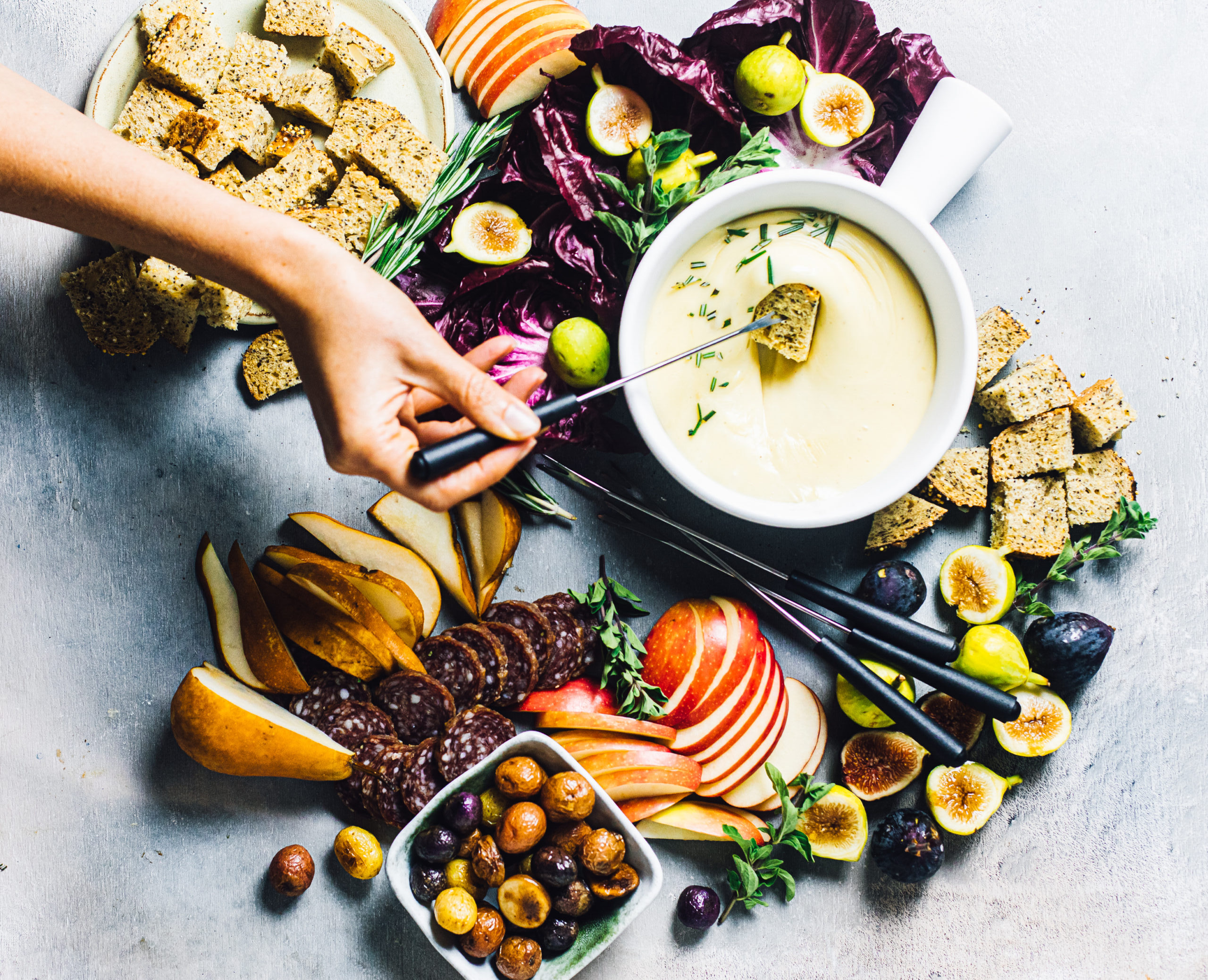 Accompaniments can vary, but one thing’s for sure: Ready them well in advance. Typical dippers, such as crusty bread or pickles, only need to be cut, but if you go with Moskowitz’s favorite—roasted brussels sprouts for a “campfire vibe”—planning’s required. Dippers with a sense of surprise include prosciutto-wrapped dates, grilled asparagus, or honey-drizzled crostini, says Fanning. Other roasted vegetables work, too, like potatoes. However, simple fare is perfectly acceptable. “[Try] good quality bread, soft pretzels, apple and/or pear slices, cherry tomatoes, grapes, broccoli and/or cauliflower,” says Freiman. “And assorted meats—seared steak, cubed ham, kielbasa slices—all make wonderful options.”