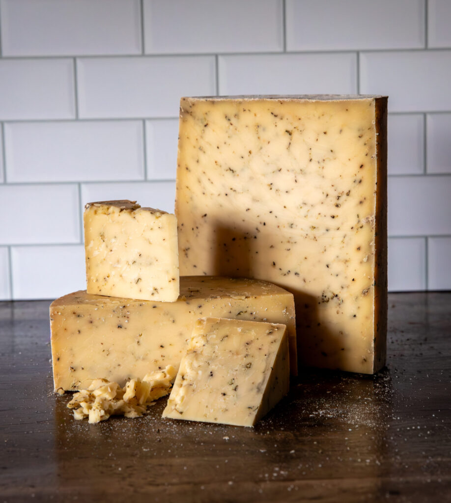 This zippy rubbed-rind cheese is no stranger to the award circuit; in 2025, it took First in its category at ACS. The base starts with pasteurized cow’s milk from Jersey cows. Once the cheese is formed, it’s rubbed with a combination of ground espresso and lavender, which enhances the bright nuttiness of the cheddar without overpowering it. While addictive on its own, Barely Buzzed is another flavored cheese that lends itself incredibly well to pairing. Robust sips like Cabernet Sauvignon and stout beer enhance the depth of flavor in the floral, coffee-forward rind, while bites of chocolate and toasted nuts bring out the cheddar’s caramel notes. MT