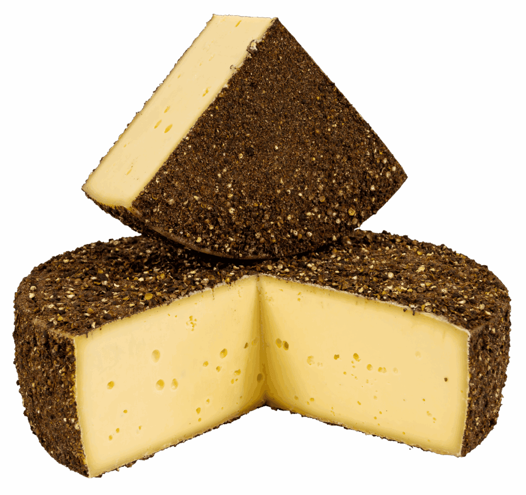 For this cheese, teamwork makes the dreamwork—namely, the collaboration between German cheesemaker Albert Kraus and the folks at Michelin-starred Restaurant Schattbuch. Shadow Blossom begins as a traditional Allgäu, a semi-hard cheese the region and cheesemaker are known for. Since 1999, Hofkäserei Kraus has produced cheese using milk from nearby herds of Brown Swiss cows. Unlike its sister cheese that’s coated in wildflowers, this wheel is coated with wild Madagascar peppercorn, long pepper, tailed pepper, Kampot pepper, pink berries, and cardamom, lending a bright, spiced taste to the paste closest to the rind. MT