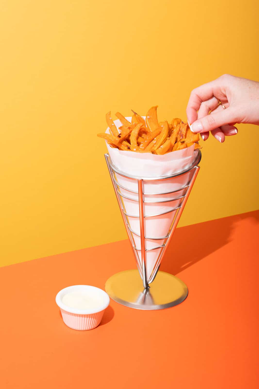 Oven-baked fries can get crispy, we promise! Here, fresh sweet potato fries are drizzled with a delectable spiced crème fraîche.