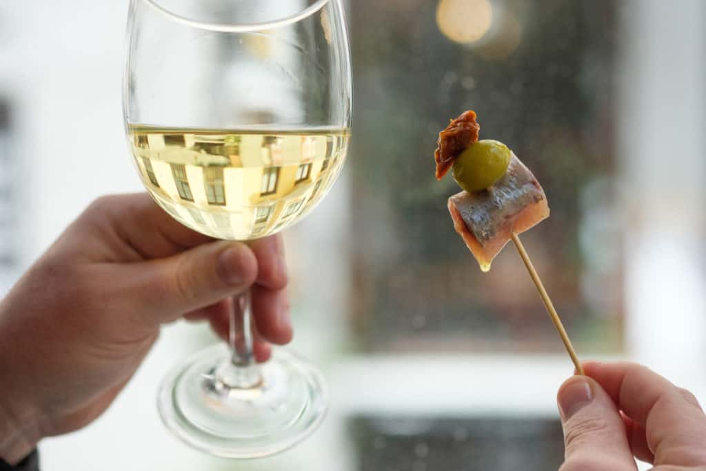 Spaniards take the potato chip and other one-bite wonders one step further. They call it an oferta, an offering, a complimentary “our house is your house” bite at tapas bars and some restaurants throughout Spain. Order a glass of wine and out comes a “micro tapa” of sorts, maybe in the form of a gilda – the classic combination of anchovy, pepper, and olive together on a toothpick. This expression of hospitality is a way to welcome customers in a disarming, delicious way. It’s also a way many Spaniards break up their workday or have it as an in-between work and home.
