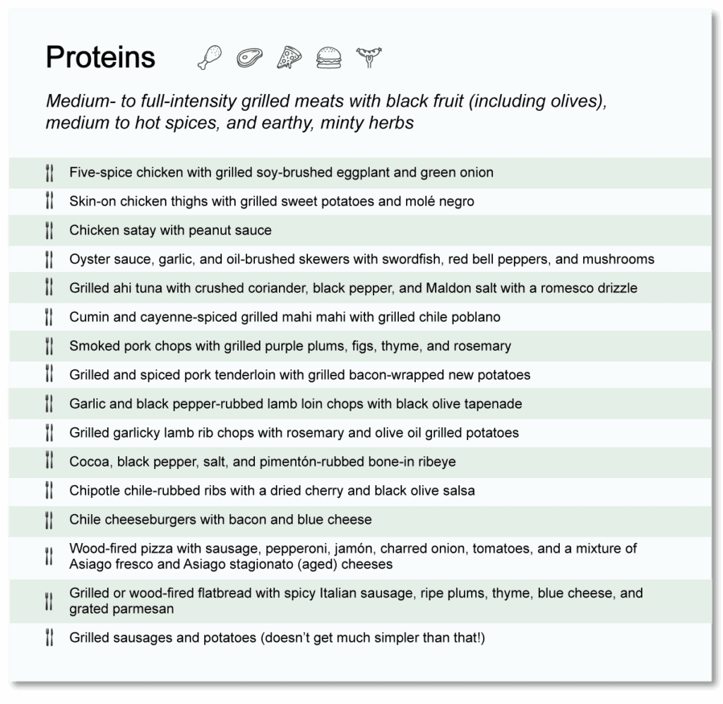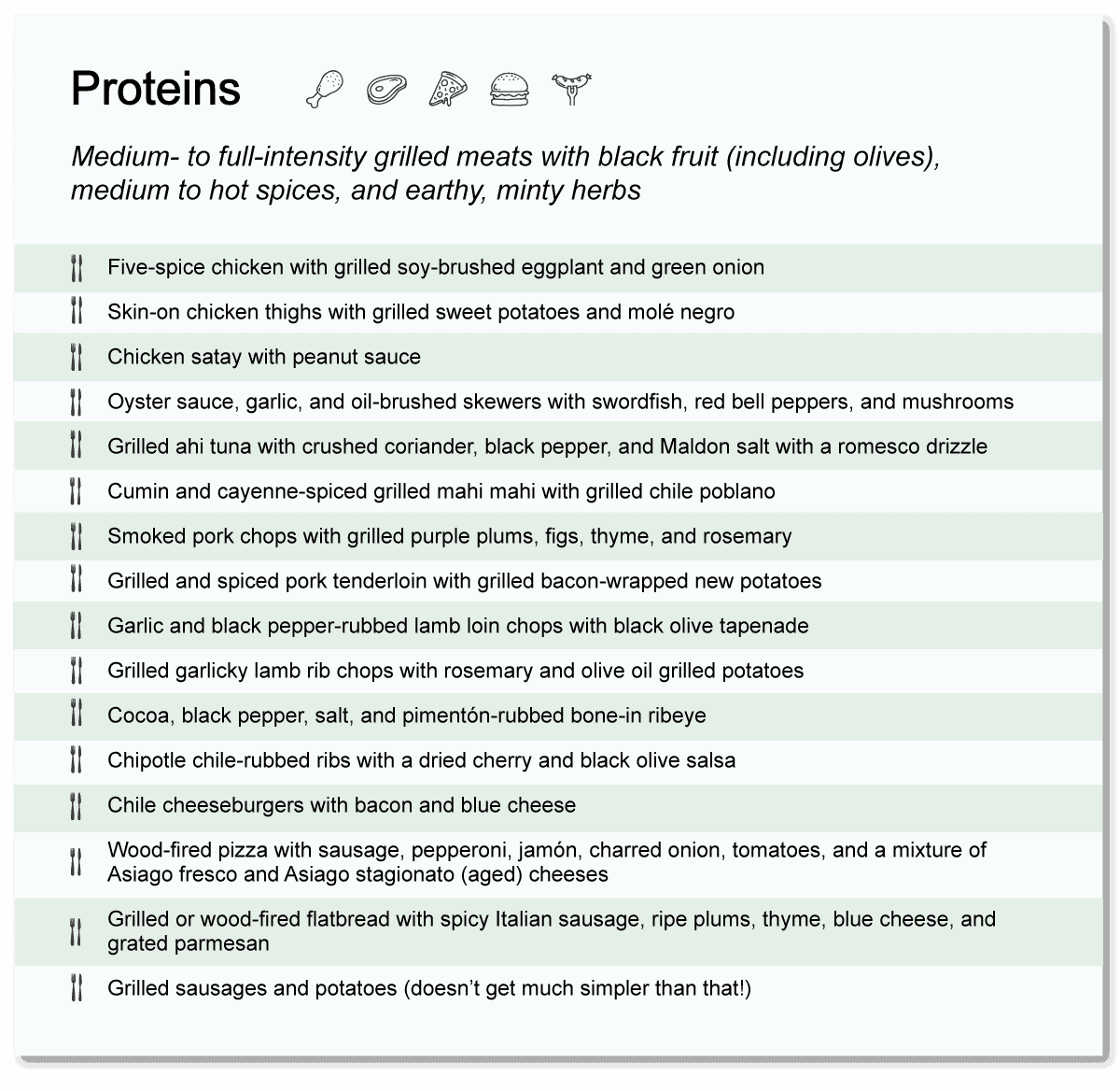 Younger and lighter Tempranillos, usually categorized as Crianzas because of their relative youth (Crianzas are defined as wines aged at least one year in oak), sport bright red fruits and light tannins and take to simple starters like jamón, dried sausage, medium-aged cheeses including Manchego, cheddar, and goat cheese among others, chicken satay, beef sliders, pepperoni pizza, dry-cured black olives with red pepper flakes, and stuffed mushrooms. Crianzas take to herbs like Thai basil, dill, and oregano while baking spices include cinnamon, clove, and nutmeg. The savory spice box for young Tempranillos includes pimentón, cayenne, black pepper, cumin, juniper berries, Chinese five-spice powder, Thai red curry (medium heat), garlic, harissa paste, and Hungarian sweet or spicy paprika.