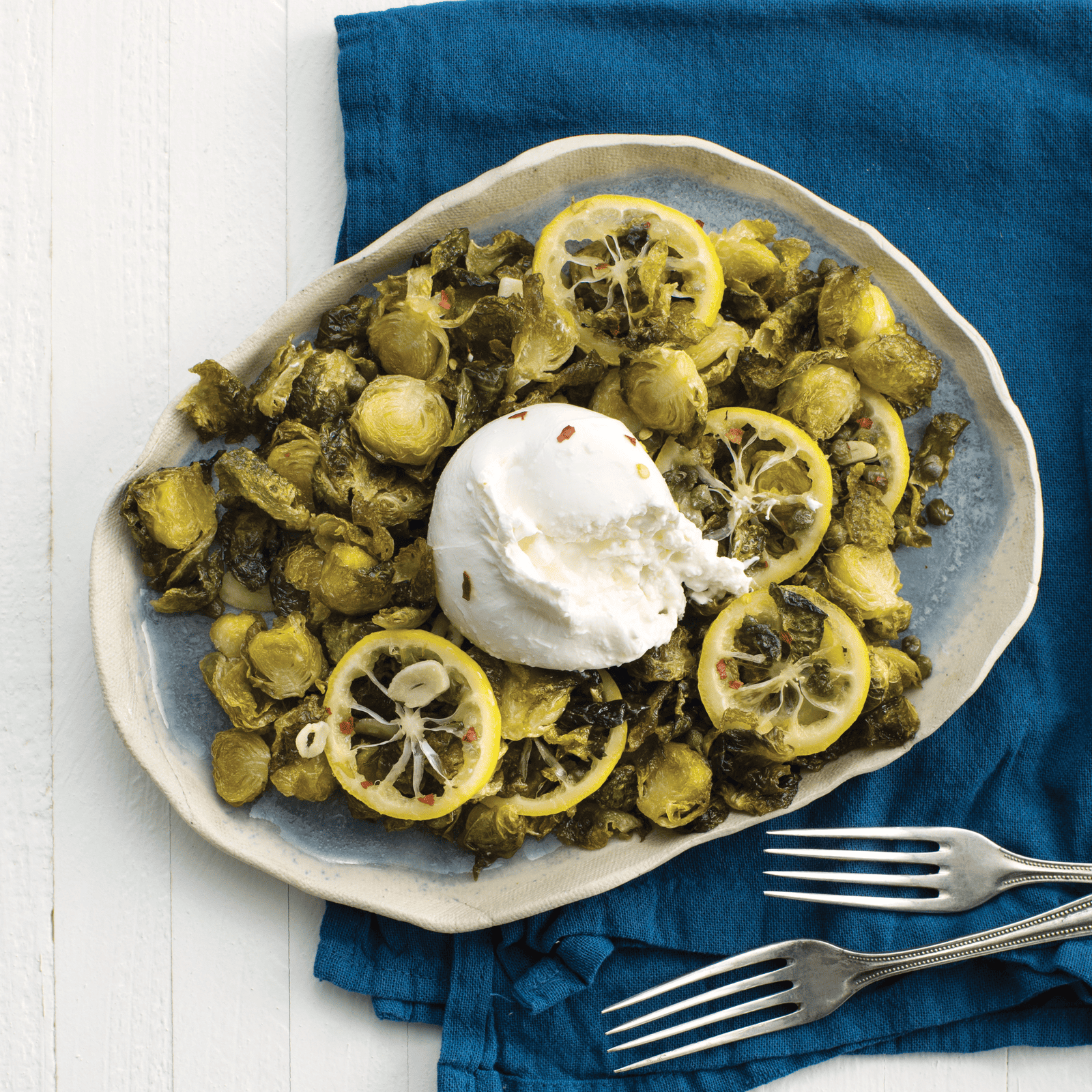 Brussels sprouts might be one of the most under appreciated vegetables, but give ’em another chance with this recipe—quickly frying the sprouts creates a crispy exterior and smoky flavor that pairs perfectly with tart lemon and creamy cheese. When frying, work quickly but carefully to ensure everything stays hot. If the oil takes a bit of time to reheat, store any already-fried ingredients in a 350°F oven.