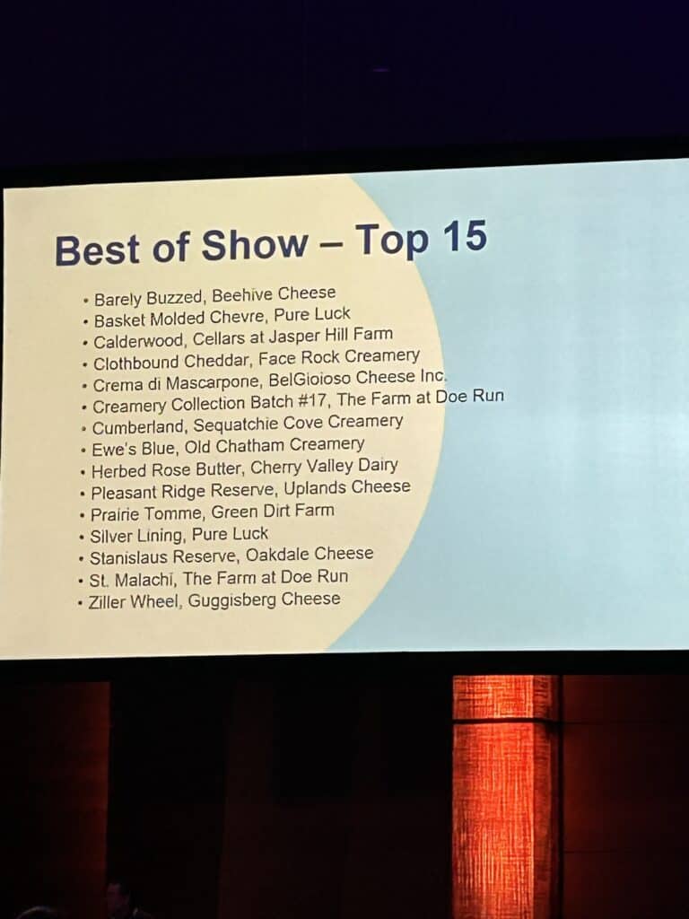 Finally, we heard from Andy Hatch of Upland’s Cheese in Wisconsin, whose Pleasant Ridge Reserve tied for Third Place Best of Show with Prairie Tomme from Missouri’s Green Dirt Farm and Basket-Molded Chevre from Pure Luck Farm in Texas. “It struck me at the end of the ceremony that of all the independent cheesemakers standing on stage, most of them were women,” Hatch said. Pleasant Ridge Reserve has the distinction of being the most-awarded cheese in American history, having won ACS First Place Best of Show three times, as well as the US Cheese Championships—the only U.S. cheese to have won both competitions. Hatch said that climate change has caused him to think about building a new barn in the next couple of years for his cows, which now graze exclusively outside during milking season. He’s also considering offering improved access to the farm, citing the agritourism opportunities pioneered by wineries. “If we can make the numbers work we want to do a better job interacting with the public, for both increased revenue and growing the market.”