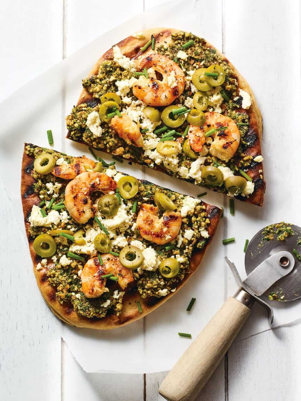 Every part of this recipe you can (and should) make from scratch—even the flatbread. So, don’t be shy. Go buy the freshest shrimp you can get your hands on, and fire up that grill for this savory, herbacious, and zesty flatbread. My favorite part? The cilantro in the pesto.