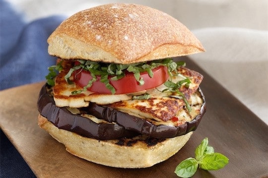 Spicy Halloumi, Eggplant, and Tomato Sandwich
