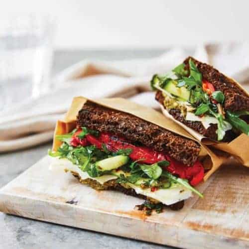 The four musketeers—marinated zucchini, asiago, roasted red peppers, and baby arugula—unite inside two pieces of scrumptiously grilled pumpernickel bread topped with velvety artichoke pesto. Make sure the zucchinis are as thinly sliced as possible, and try adding paper-thin prosciutto for a salty punch.