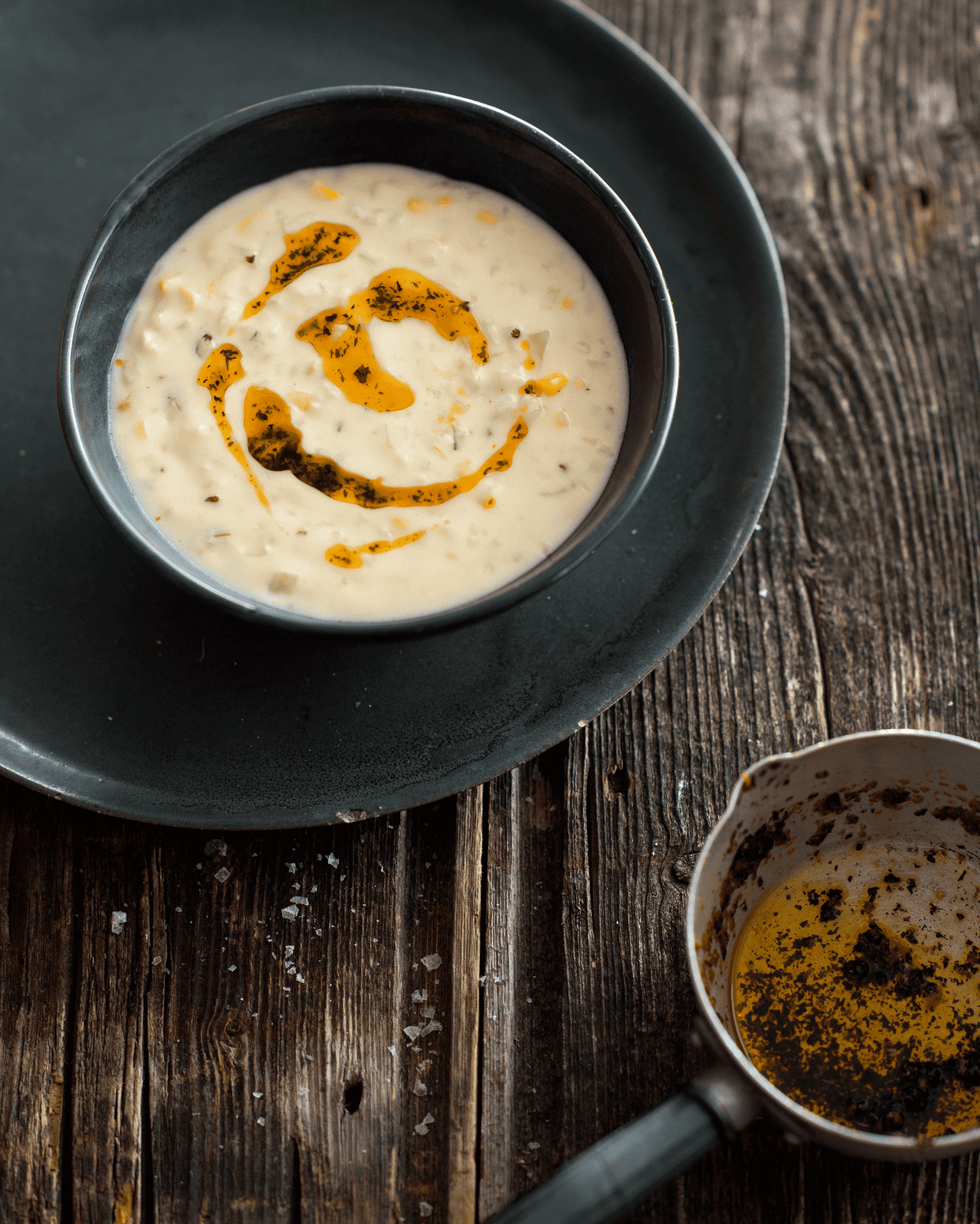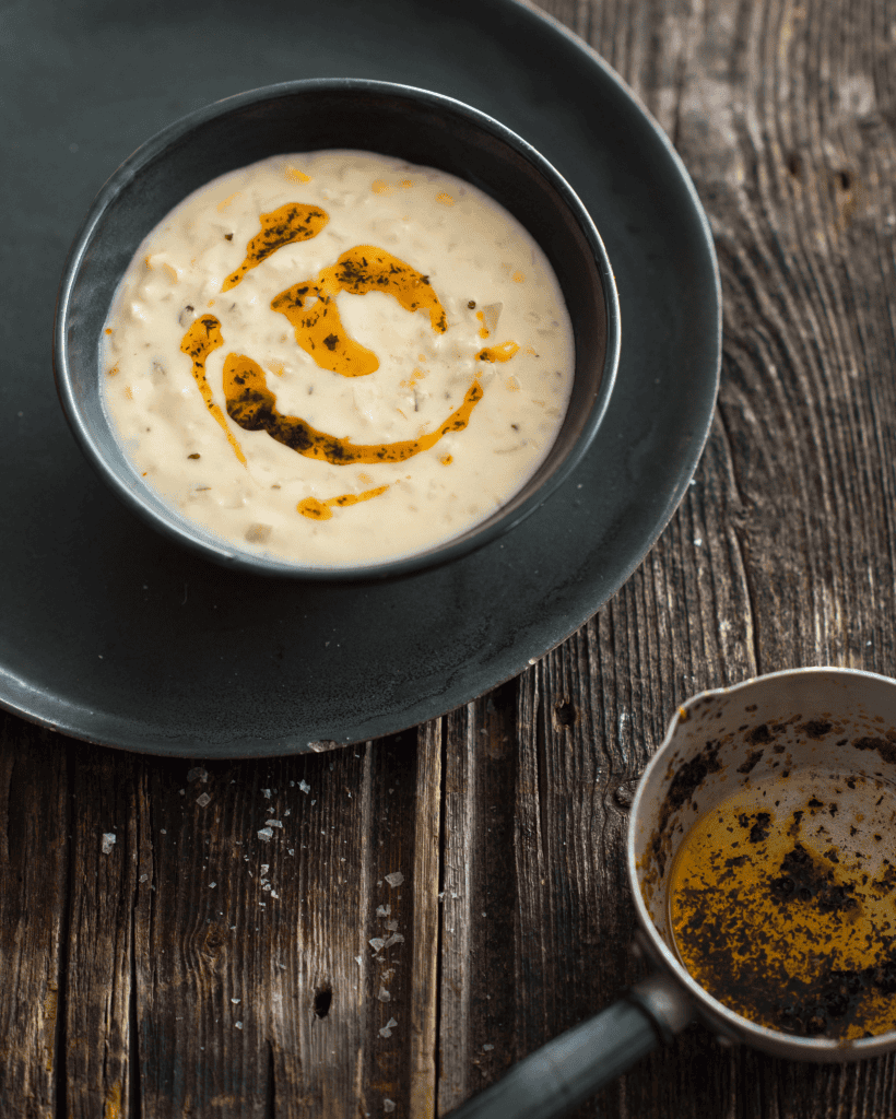 Fresh Corn Soup with Rice, Yogurt, and Sizzling Mint Butter