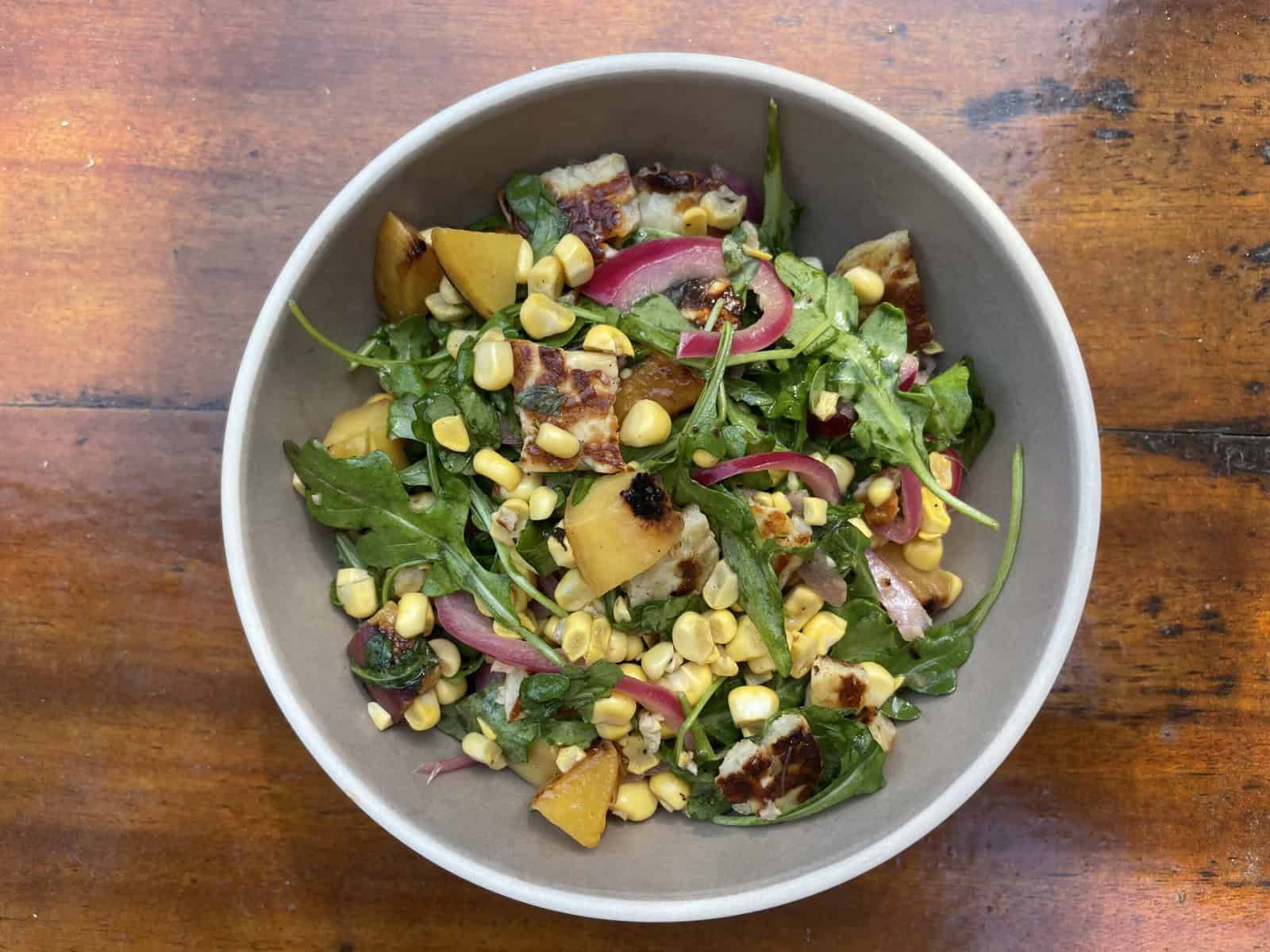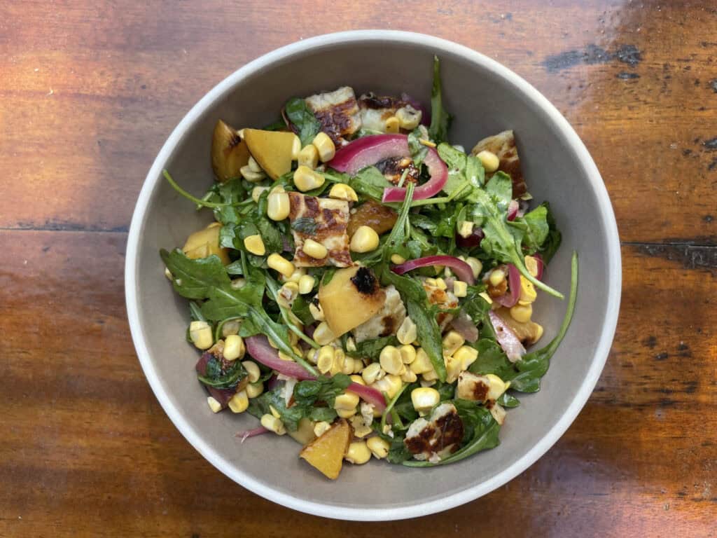 - While peaches and halloumi cool, add corn and mint to a large bowl.
