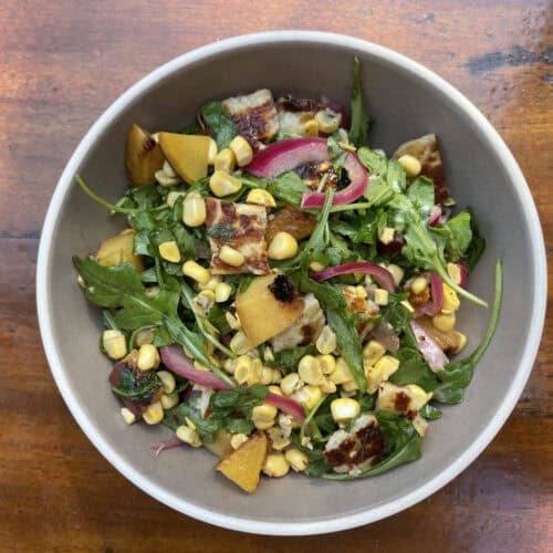 - Once cool to slightly warm, cut halloumi and peaches into 1⁄2-inch pieces and add to the bowl, along with arugula, 3⁄4 cup pickled onions, 2 tablespoons pickling liquid, a generous pinch of salt, a drizzle of olive oil, and reserved skillet oil and juices.