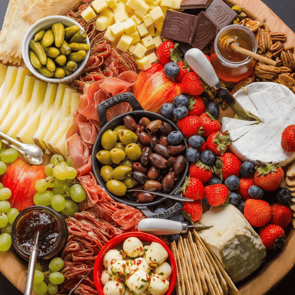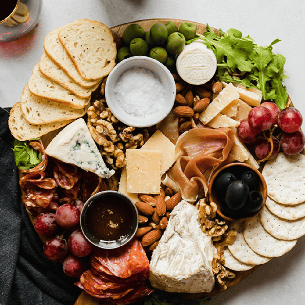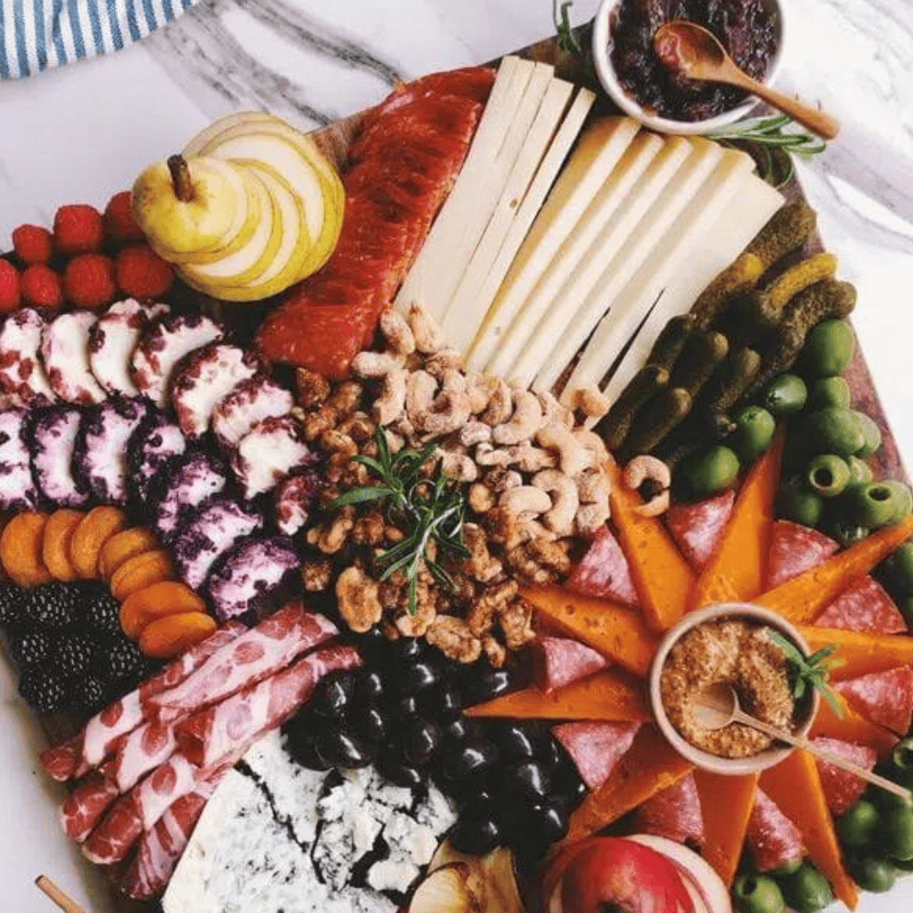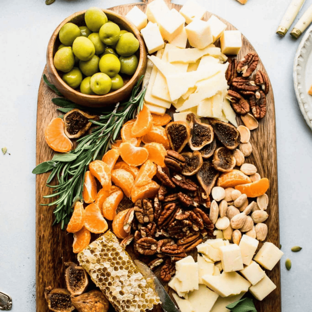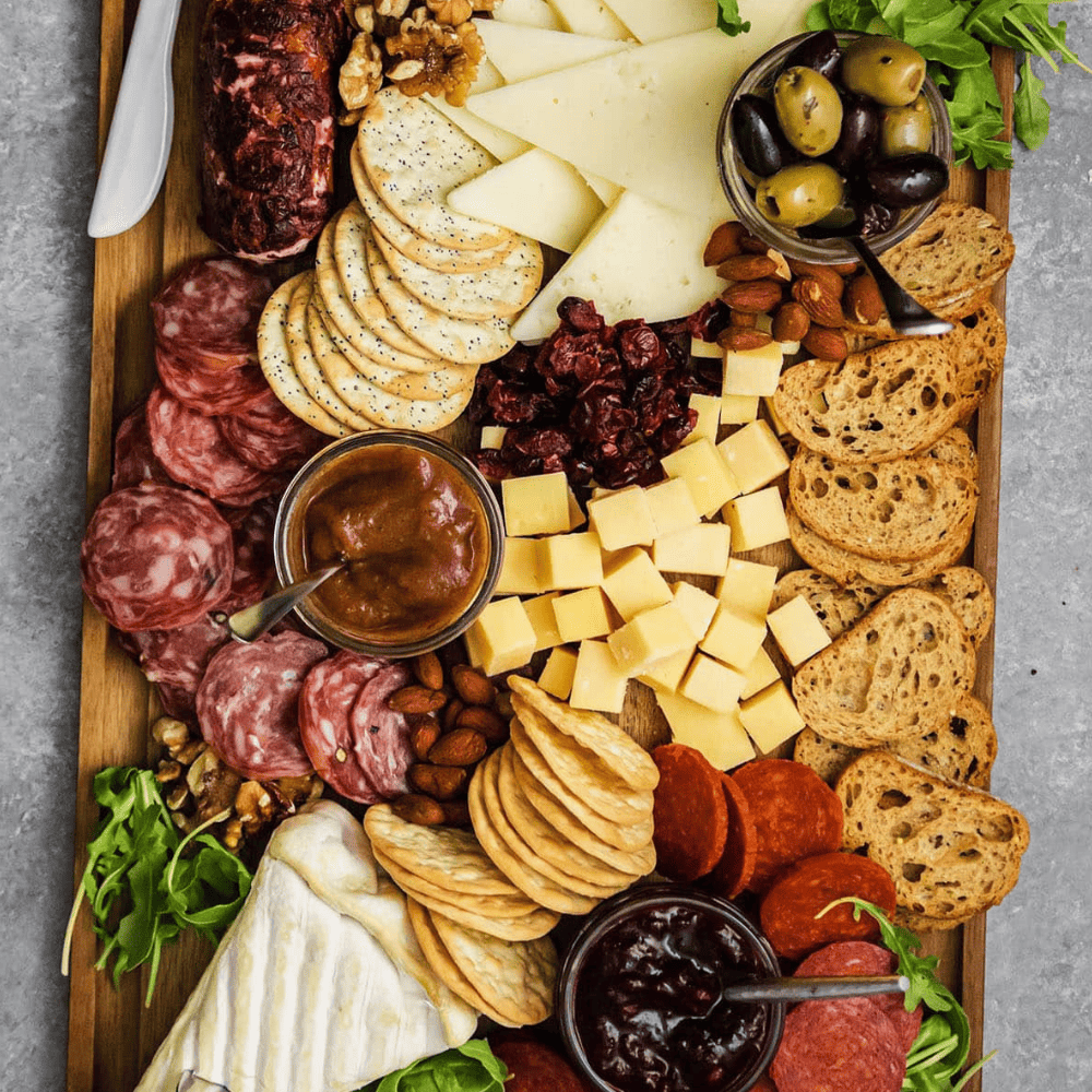 Keep the ingredients on your board seasonal by adding winter cheeses like Vacherin Mont d’Or or Rush Creek Reserve, fruits like cranberries or figs, and accompaniments like pumpkin spice crackers or fruit cake crisps.