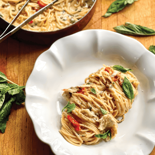 Spaghettini with Baked Goat Brie, Pancetta, Toasted Garlic, Sun-Dried Tomatoes, and Basil
