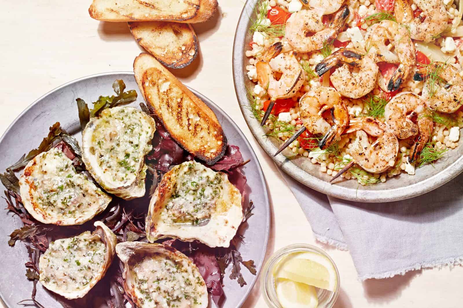 New Orleans-Style Charbroiled Oysters & Grilled Shrimp Skewers with Feta