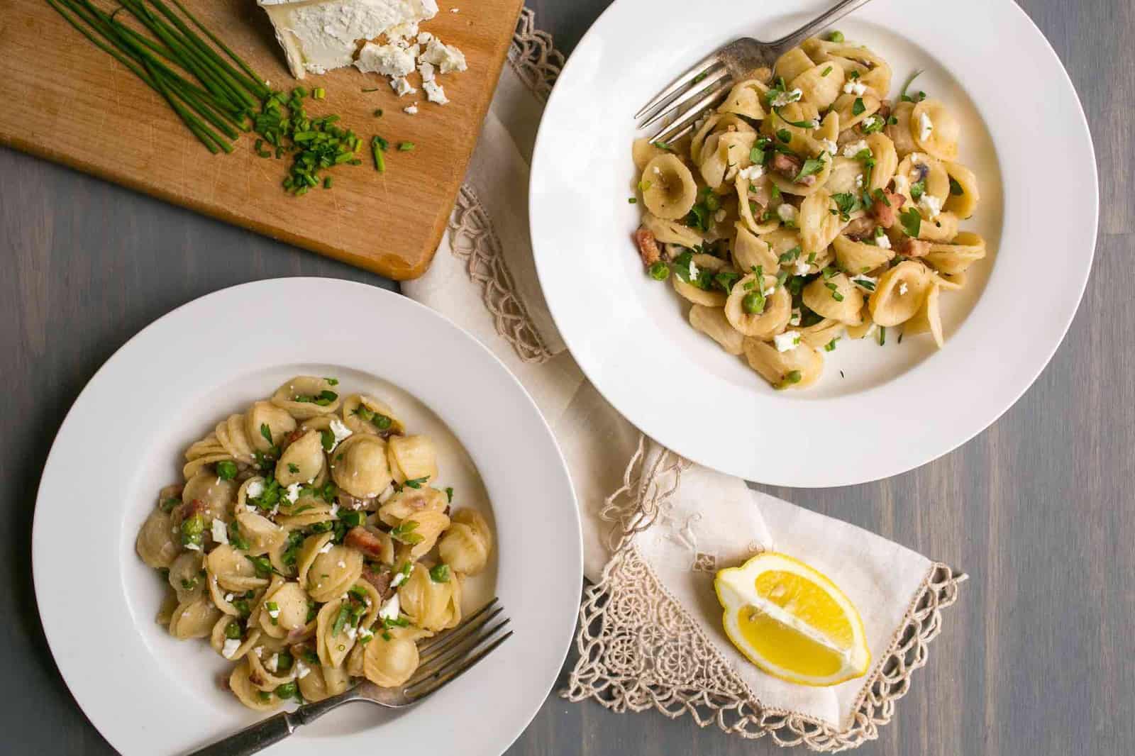 - Serve the pasta in shallow bowls garnished with more crumbled goat cheese, a sprinkling of chives and parsley, and a few cracks of black pepper.