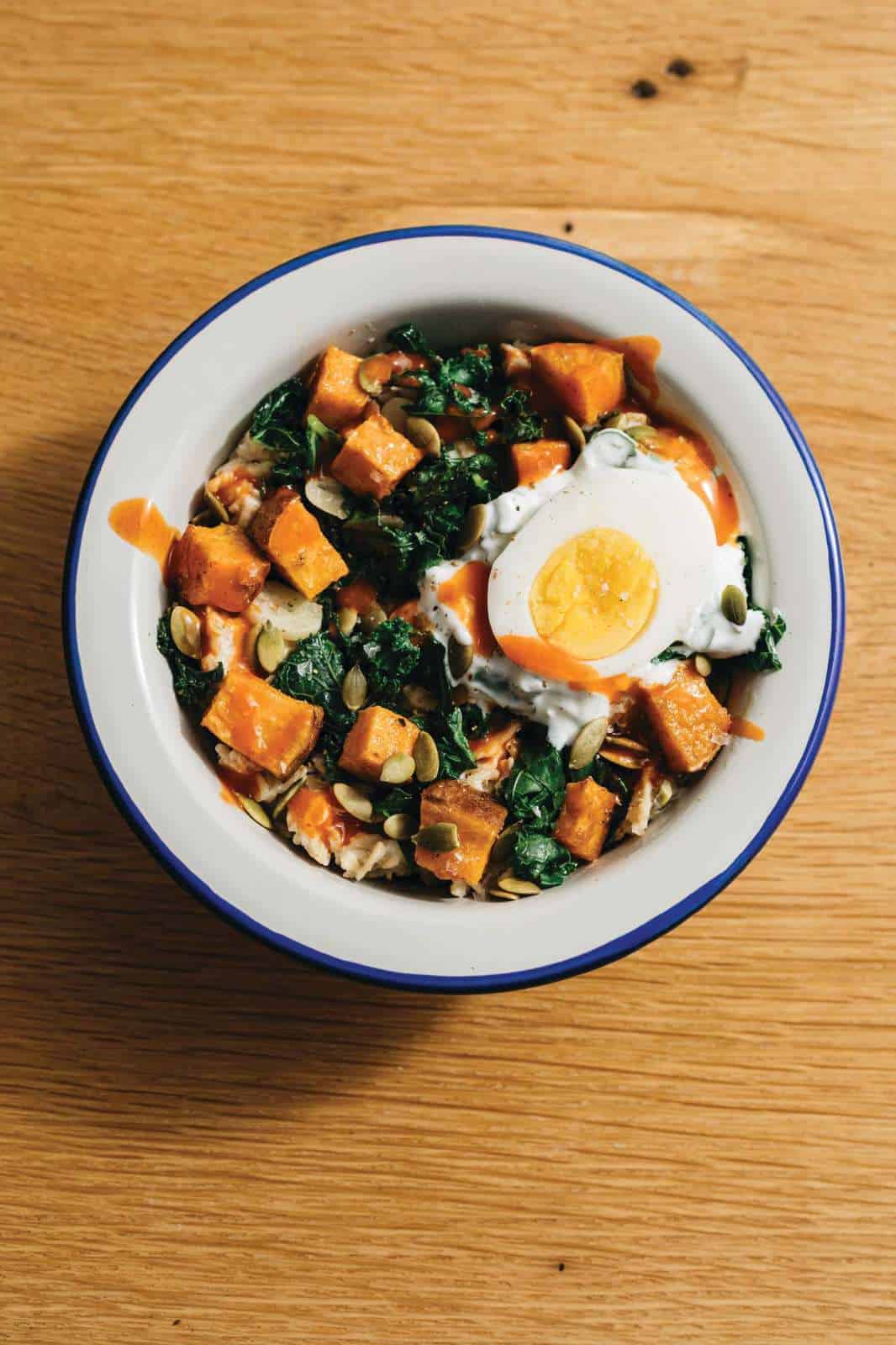 Oats work as a starchy vehicle—for sweet and savory toppings. Here, we top the whole grain with cumin- and coriander-spiced sweet potatoes, garlicky sautéed kale, a jammy egg, and fromage blanc brightened with cilantro and citrus zest.
