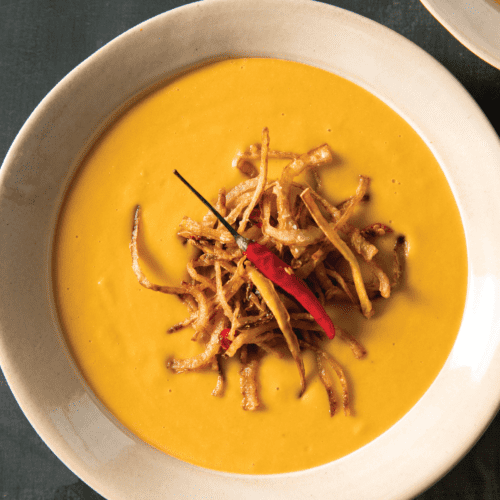 Clothbound Cheddar Pumpkin Soup with a Crispy Onion, Ginger, and Chilies Garnish