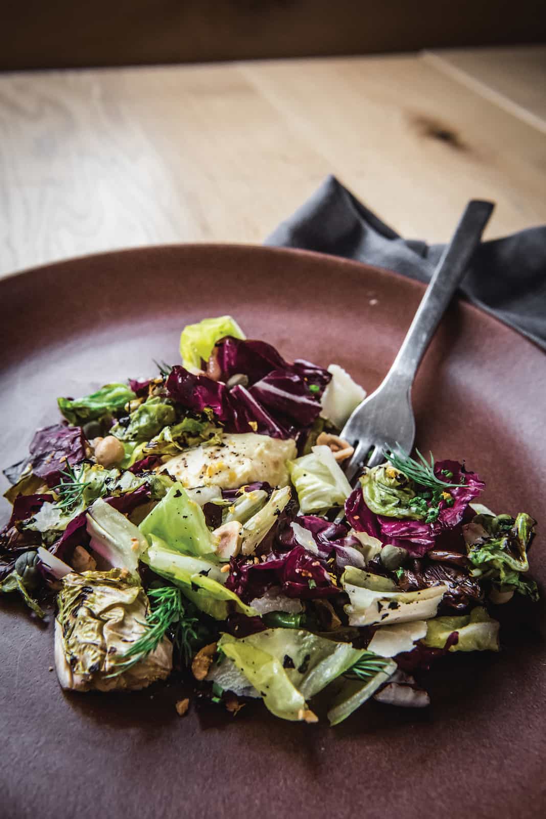 Creamy parmesan custard, rich brown butter vinaigrette, and crunchy hazelnuts create a delicious counterbalance to bitter greens.