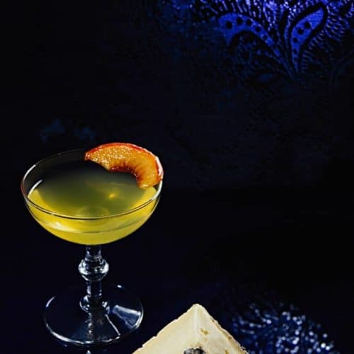 - Double strain into coupe glass and garnish with caramelized peach segment.