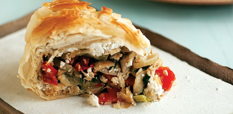 Rich dark-meat chicken, savory veggies, and flaky phyllo dough make this a perfect pie for warm nights on the patio.