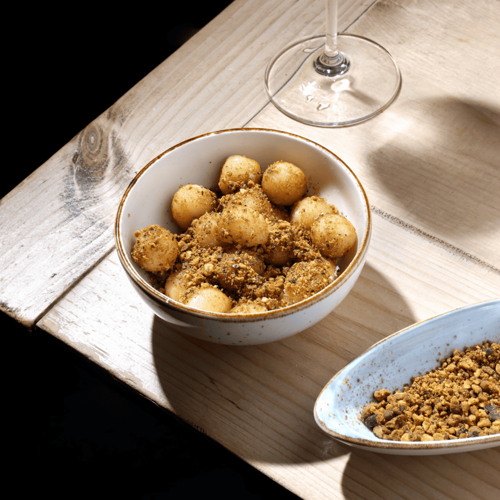 Fried Goat Cheese with Pistachio Dust, Pepper, and Vanilla Honey