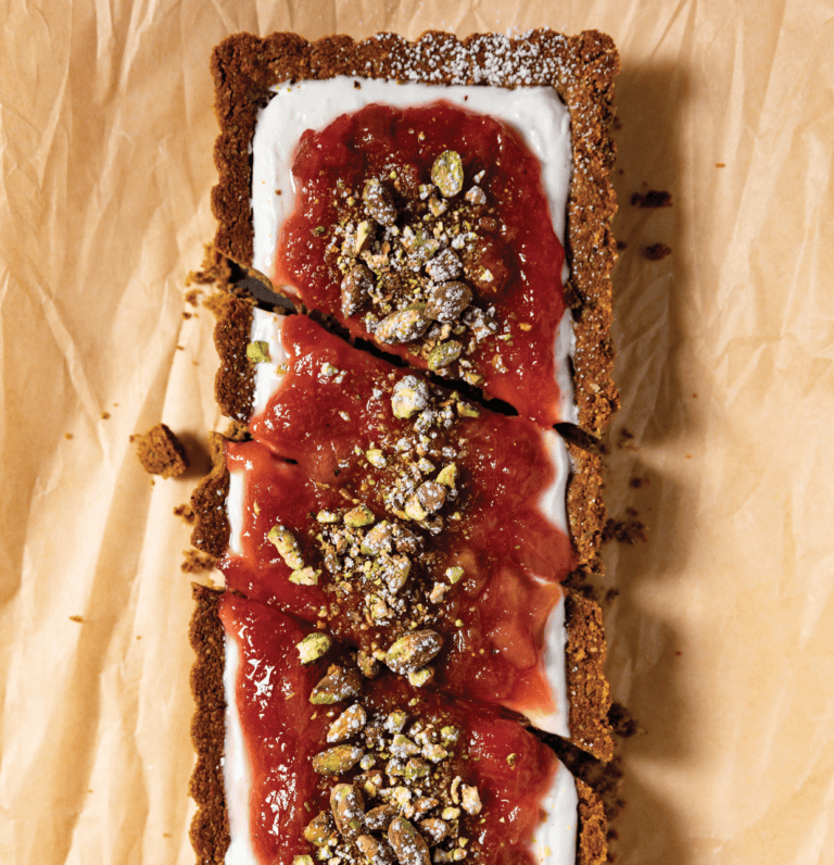 Chèvre and Honey Tart with Pistachio Crust and Rhubarb Compote