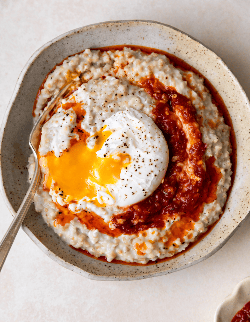 Savory Chèvre Oatmeal with Poached Egg and Chili Crisp