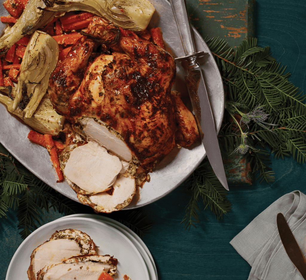 A zingy, flavor-packed goat cheese is slipped under the skin of this bird before harissa, a North African chile pepper paste, paints it a brilliant red and adds an extra kick of heat. Placed over a bed of fennel and carrots, the chicken keeps moist while the vegetables become infused with pan drippings during roasting. You’ll need to prep the chicken the day before you plan to serve this dish.