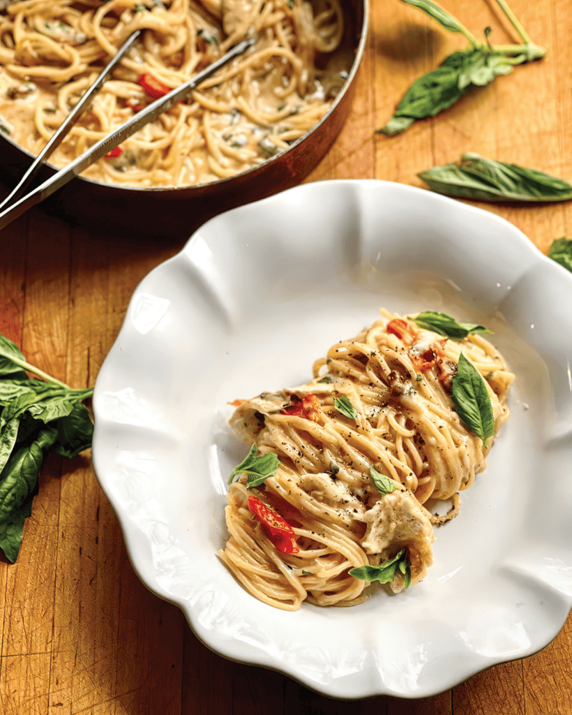 There are plenty of pasta-worthy days in the summer. Sweet and peppery basil, salty pancetta, and tangy goat brie twirled with thin pasta make for a decadent dinner. Pair with a chilled sauvignon blanc. The rinds of the goat cheese wheels are edible and add to the luxurious texture of this sauce.