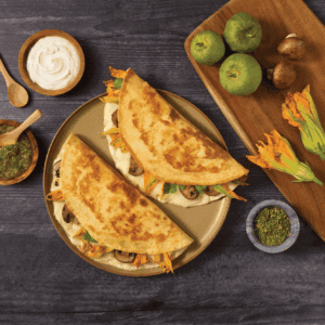 A savory, aromatic quesadilla filled with sautéed mushrooms, delicate squash blossoms, fragrant epazote, and gooey queso Oaxaca. Lightly crisped on the outside and melty inside, it’s a seasonal, floral, earthy dish perfect with salsa verde and sour cream.