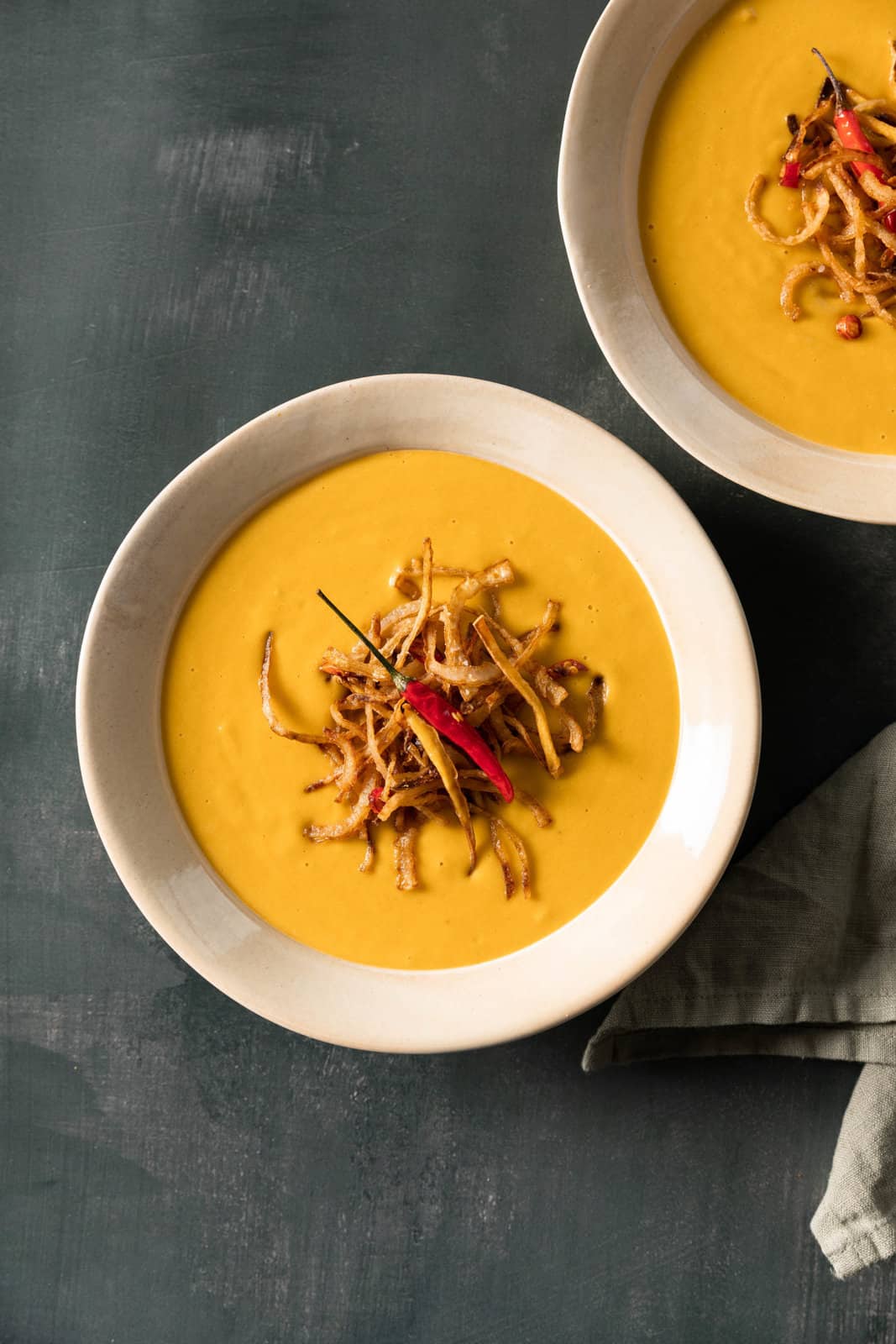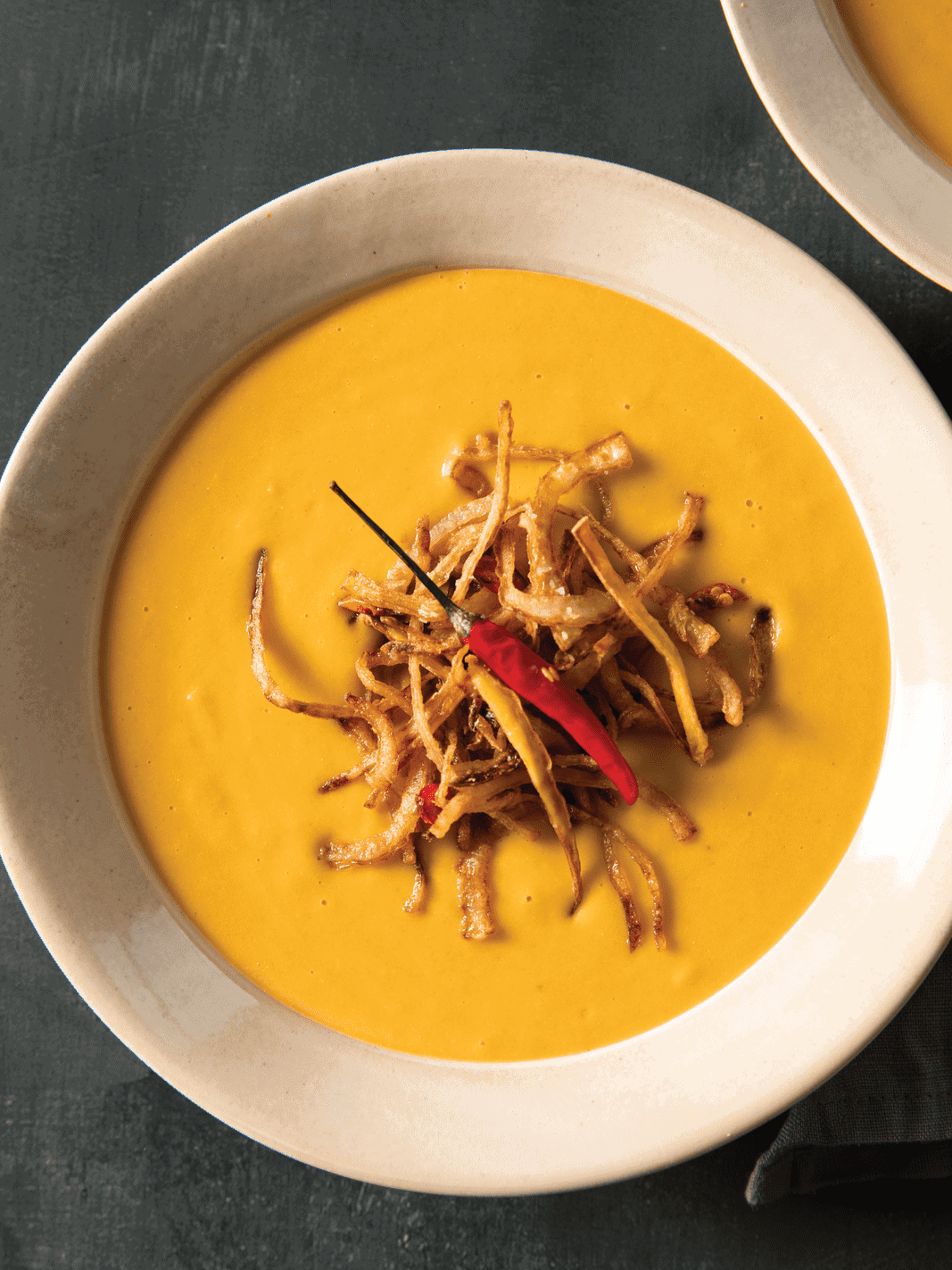 Make this easy soup with butternut, acorn, or any similar squash from the farmers’ market, and be sure to enjoy it with the spicy crispy onion garnish. An immersion blender can be used instead of a countertop blender.