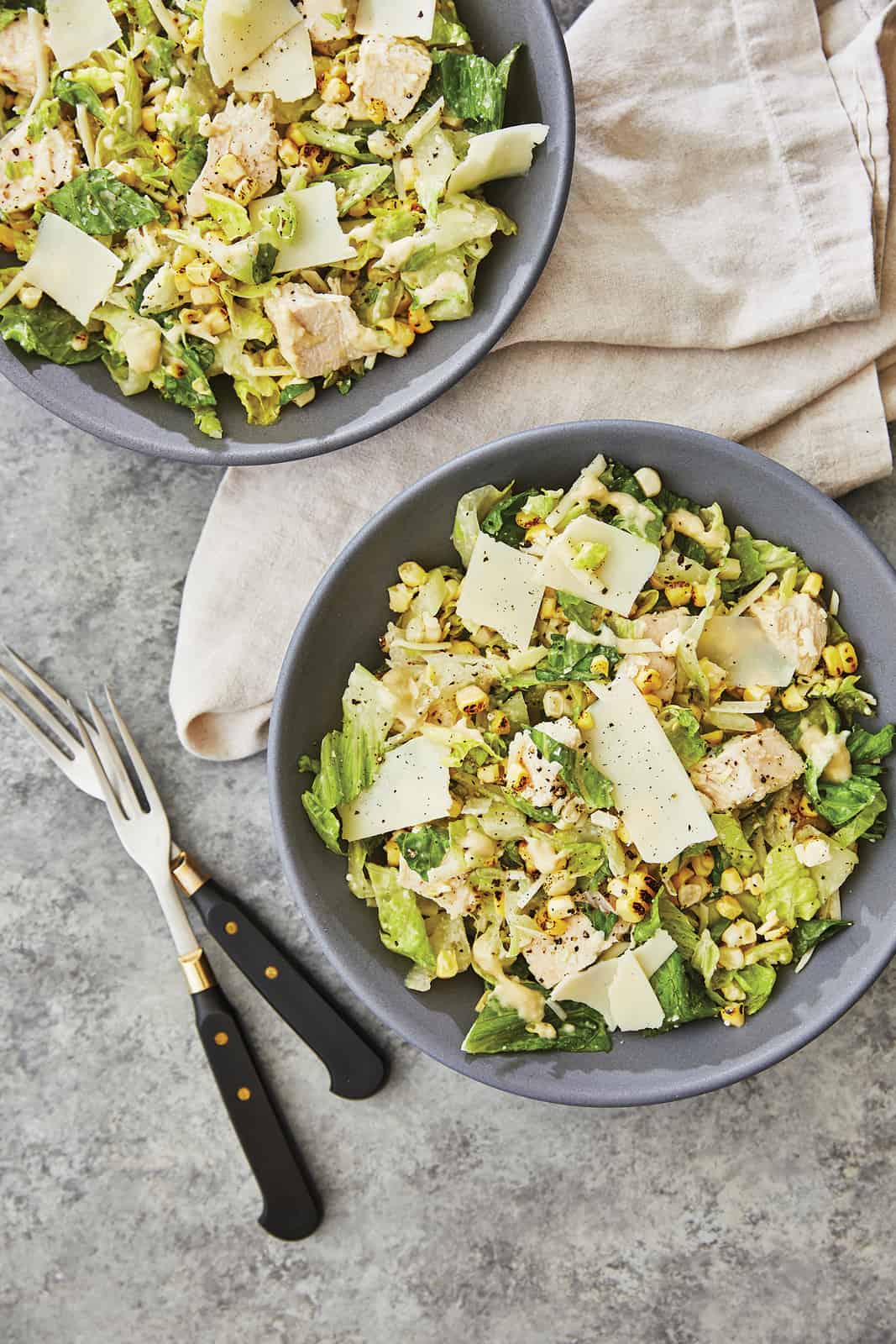 Chicken Caesar Salads with Asiago and Grilled Corn