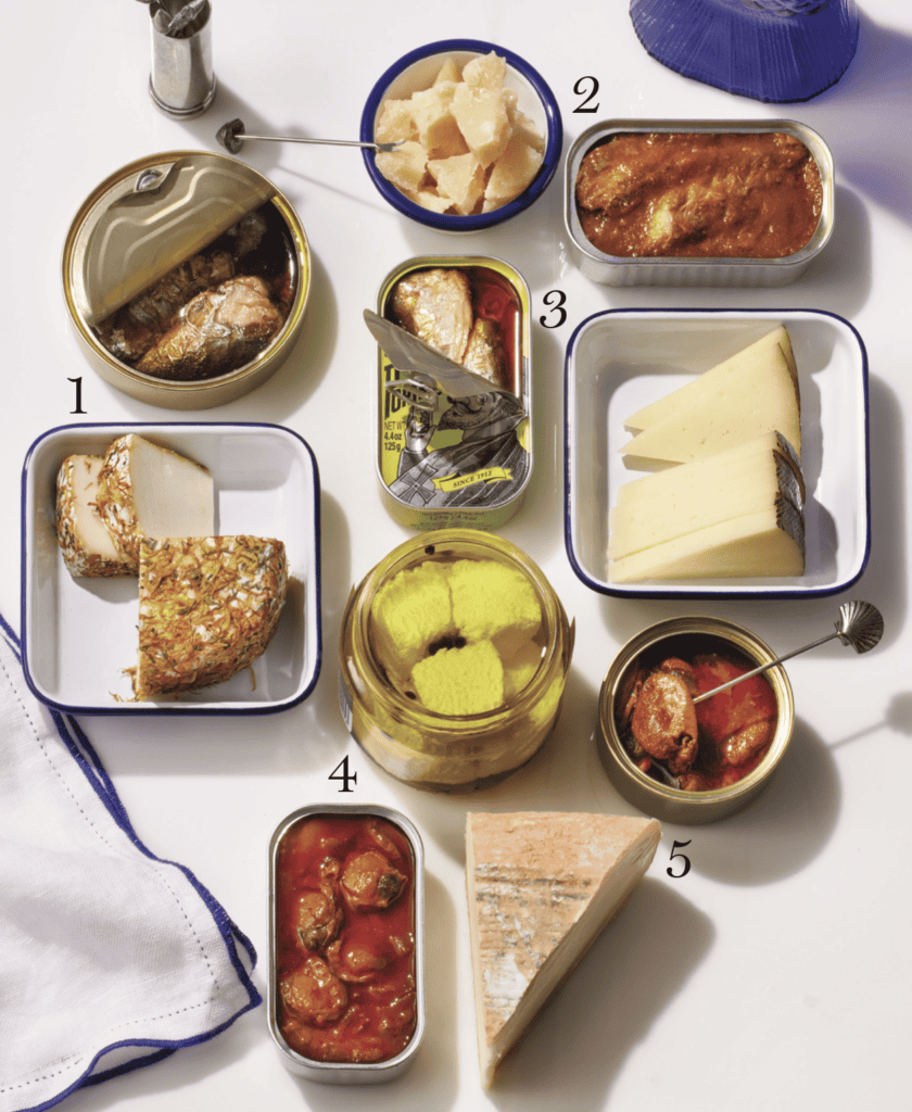 We asked Vieira to curate a cheese board with tinned fish. “Like anything you pair with cheese, tinned fish has a ton of character and different styles, and different producers work differently with different cheeses,” she notes. “Often, I tend to question: is the cheese the star, or is the fish the star? Some are more neutral—such as a sardine in high quality olive oil—but there are also ones such as curry mackerel, where you have to be a little more intentional in how you pick your cheese pairing.”
